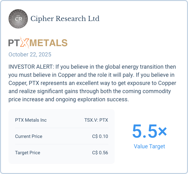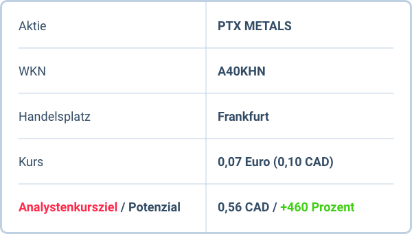 Als Kirsche auf der Torte hält PTX METALS darüber hinaus sieben Royalty-Vereinbarungen mit verschiedenen Rohstoff-Projekten in Ontario – Early Stage, aber im Erfolgsfall mit einem riesigen Hebel auf den Aktienkurs, dessen Potenzial von den Experten von Cipher Research mit einem auf CAD 0,56 erhöhten Kursziel auf mehr als 400 % taxiert wurde.