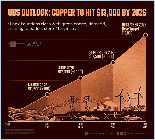 Bemerkenswert ist eine neue Studie zum Kupfermarkt aus dem Hause der schweizerischen Großbank UBS, die bei Kupfer einen »perfekter Sturm« aufziehen und die Kupferrallye denn auch erst am Anfang sieht. Der UBS zufolge soll sich das Jahr 2026 für den Kupferpreis extrem bullish entwickeln.