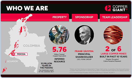 Das Management-Team hat bereits für andere Unternehmen zwei der insgesamt nur sechs in den vergangenen zehn Jahren neuen Kupferminen gebaut, dazu ist COPPER GIANT Teil der Fiore-Gruppe des bekannten Rohstoff-Investors Frank Giustra, der als Co-Gründer von Aris Mining (in diesem Jahr von CAD 5 auf rund CAD 20) in Kolumbien bereits großen Erfolg verzeichnet.