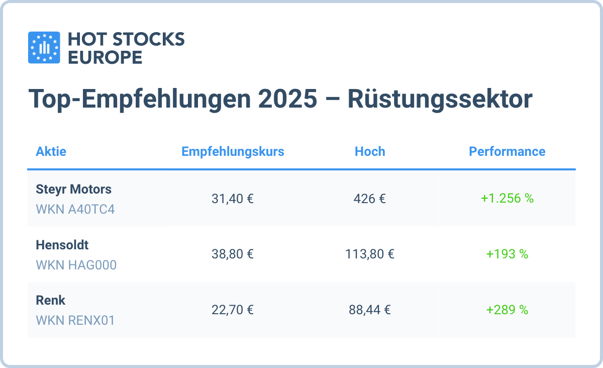 2025 war erneut das Jahr der europäischen Defence-Werte. Hensoldt und Renk erzielten nach Empfehlung 100–300 % Gewinn, unterstützt durch: