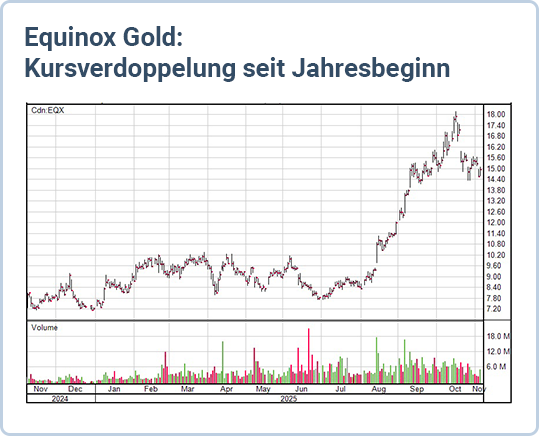 Entsprechend zuversichtlich gibt sich das Management beim Ausblick: Im vierten Quartal dürfte Valentine das obere Ende der Produktionsziele zwischen 15.000 und 30.000 Unzen Gold erreichen, im kommenden Jahr soll die Mine zwischen 150.000 und 200.000 Unzen zur Gesamtproduktion von EQUINOX GOLD beitragen.