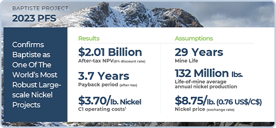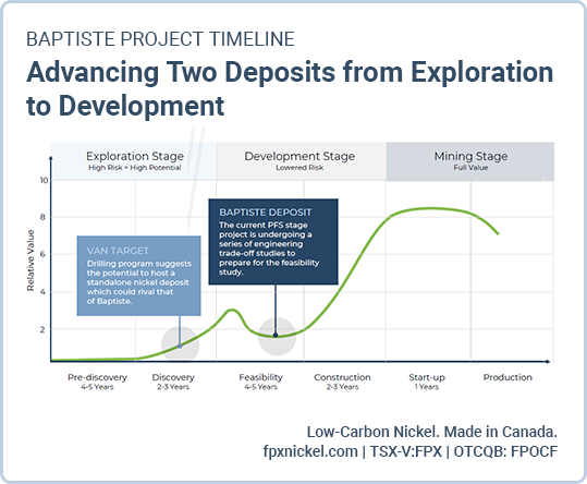 Hauptasset von FPX NICKEL innerhalb des Gebietes ist das Baptiste-Vorkommen, die weltweit drittgrößte noch unentwickelte Nickel-Lagerstätte, mit der FPX Nickel Analystenschätzungen zufolge mit einer Jahresproduktion von über 100 Mio. Pfund grünem und batteriefähigem Nickel pro Jahr zu einem der zehn größten Nickelproduzenten der Welt aufsteigen könnte. Seit 2010 wurden rund USD 30 Mio. für die Exploration und Erschließung von Baptiste ausgegeben.