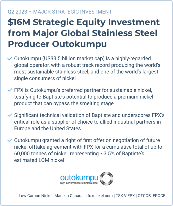 Als eines der größten noch unentwickelten Nickelprojekte der Welt stehen Interessenten bei FPX NICKEL Schlange! Im ersten Quartal 2024 hat sich mit der milliardenschweren Sumitomo Metal Mining niemand Geringerer als einer der ganz großen Nickelproduzenten im Volumen von CAD 14,4 Mio. an FPX NICKEL beteiligt und sich ein Recht auf eine Abnahmevereinbarung gesichert.
