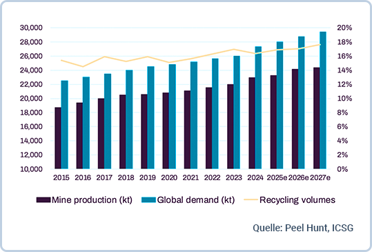 Gleichzeitig bleibt das Angebot begrenzt: sinkende Erzgehalte, wiederkehrende Produktionsunterbrechungen und die langen Vorlaufzeiten bis zur Inbetriebnahme neuer Minen bremsen die Förderung weiterhin.