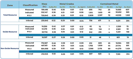 Die 2017 veröffentlichte Pre-Feasibility-Studie ermittelte einen historischen Nettobarwert nach Steuern von USD 1,038 Milliarden, basierend auf USD 3,35 je Pound Kupfer, USD 10,00 je Pound Molybdän und USD 1.400 je Feinunze Gold.