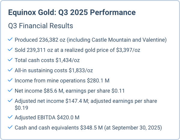 EQUINOX GOLD hat im dritten Quartal eine Rekordproduktion und einen neuen Rekordumsatz verzeichnet. Zwischen Anfang Juli und Ende September produzierte das Unternehmen insgesamt 236.382 Unzen Gold zu AISC-Gesamtkosten von USD 1.833 je Unze, womit EQUINOX GOLD einen neuen Quartalsrekord aufstellen konnte.