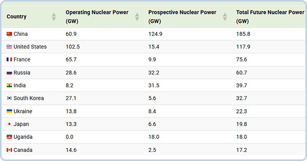 436 Reaktoren sind derzeit weltweit am Netz – Tendenz kräftig steigend: 66 Anlagen befinden sich momentan im Bau, wovon allein 32 in China errichtet werden. Das Land ist auf klar auf Kurs, der weltweit dominierende Produzent von Atomenergie zu werden. Nimmt man alle bestehenden und im Bau befindlichen Anlagen zusammen, übertrifft die Kapazität Chinas mit fast 186 GW jene der USA bereits bei weitem. Der Ausbau der Kernenergie hat große geopolitische Auswirkungen, können die Länder sich mit einer konsequenten Erweiterung ihrer Kapazitäten die Abhängigkeit von fossiler Energie reduzieren.