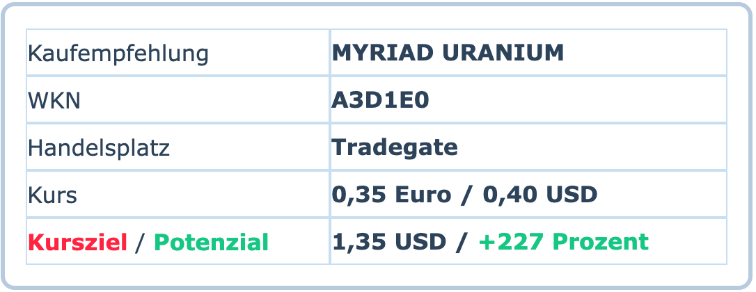 Verlag, Autor oder nahestehende Dritte halten Positionen in folgenden in diesem Brief genannten Aktien: –. Die Analysen folgender in dieser Veröffentlichung genannten Gesellschaften sind entgeltlich erstellt worden: Myriad Uranium. Auf die damit verbundenen möglichen Interessenskonflikte wird ausdrücklich hingewiesen.