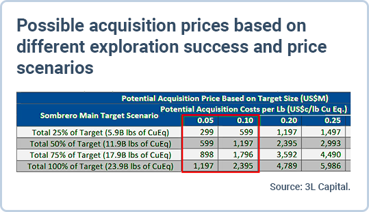 Die Analysten von 3L erwarten, dass auch COPPERNICO von einem großen Player (Großaktionär Teck?) übernommen werden könnte, bevor noch eine offizielle Ressource veröffentlicht werden wird. Je nach Höhe der Kupferressource errechnen die Analysten für das Sombrero-Asset einen fairen Wert zwischen USD 300 Millionen und USD 2,3 Milliarden, mithin in der Spitze das Fünfzigfache der heutigen Marktkapitalisierung!
