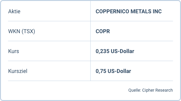 Der Kurs von COPPERNICO METALS mag sich in den vergangenen Monaten verdoppelt haben, mit einem Börsenwert von gerade einmal CAD 40 Millionen bietet sich Investoren aber die Chance auf eine Vervielfachung des Einsatzes.