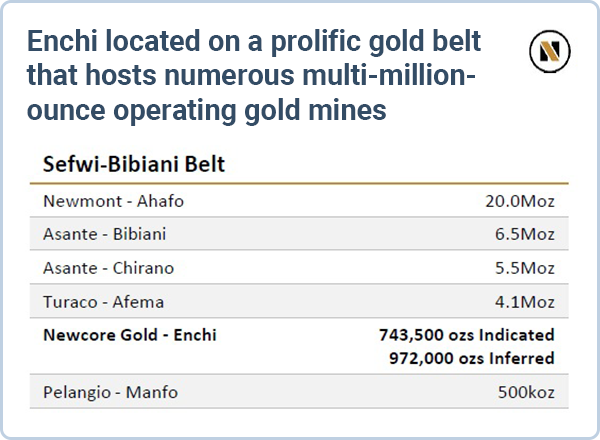 In diesem spannenden Umfeld treibt NEWCORE GOLD die Entwicklung seines Enchi-Goldprojekts voran, das geologisch betrachtet im Sefwi-Bibiani-Goldgürtel liegt, der gleich mehrere Multi-Millionen-Unzen-Lagerstätten beherbergt – darunter auch die 20 Mio. Unzen umfassende Ahafo-Goldmine von Newmont sowie die Bibiani- und Chirano-Minen von Asante Gold.