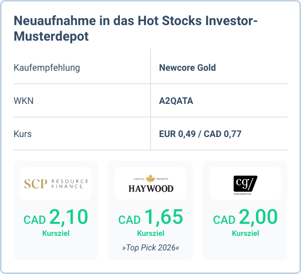 Alle drei Researchadressen haben in diesem Jahr bereits ein Update veröffentlicht, nachdem das Unternehmen Anfang Januar starke Bohrergebnisse gemeldet hatte Haywood Securities empfiehlt NEWCORE GOLD mit einem Kursziel von CAD 1,65 zum Kauf, bezeichnet die Aktie dazu noch als »Top Pick« für 2026.