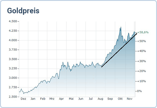 GOLD wird 2025 ein fantastisches Jahr mit neuen Allzeithochs verzeichnen. In den vergangenen 12 Monaten hat das Edelmetall um fast 60 % zugelegt! Die technisch bedingte Korrektur von Ende Oktober ist abgehakt, inzwischen scheint der Goldpreis wieder auf seinem übergeordneten Aufwärtstrend in Richtung der bisherigen Höchststände zu klettern.