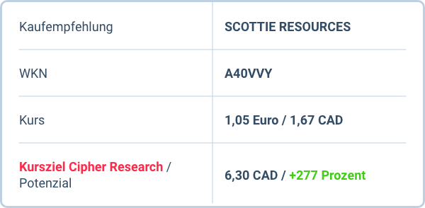Verlag, Autor oder nahestehende Dritte halten Positionen in folgenden in diesem Brief genannten Aktien: –. Die Analysen folgender in dieser Veröffentlichung genannten Gesellschaften sind entgeltlich erstellt worden: Scottie Resource. Auf die damit verbundenen möglichen Interessenskonflikte wird ausdrücklich hingewiesen.
