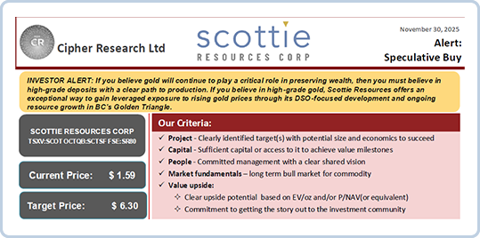 Mit der Veröffentlichung einer PEA-Studie hat SCOTTIE RESOURCES in diesem Herbst für ordentlich Aufmerksamkeit gesorgt! So hat das Scottie-Goldminen-Projekt schon bei einem Goldpreis von USD 2.600 je Unze einen Net Present Value von USD 215,8 Millionen ergeben, auf Basis des aktuellen Goldpreisniveaus von USD 4.200 je Unze sogar einen NPV in Höhe von USD 668,3 Millionen.