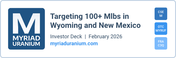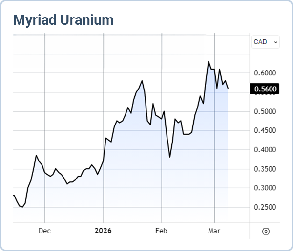 Die Ausgangslage bei MYRIAD URANIUM ist deshalb extrem spannend! Wir haben Ihnen den Titel bereits im vergangenen November an dieser Stelle vorgestellt, seitdem ging es für den Aktienkurs von CAD 0,25 bis auf bis zu CAD 0,65 um sage und schreibe 160 % nach oben.