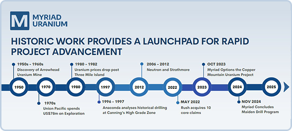 Während des Uran-Booms 2007 ist das Interesse am Copper Mountain-Projekt schon einmal durch die Decke geschossen: Mit Neutron Energy und Strathmore hielten zwei Unternehmen Teile des Copper Mountain-Projekts, schafften es dabei aber nicht, die Hauptzonen des Projekts zu konsolidieren.
