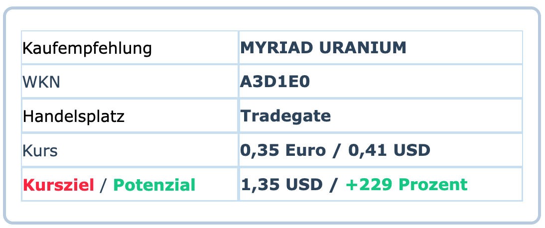»We are bullish on MYRIAD URANIUM«, ließen damals auch die Experten von Singular Research keinen Zweifel an ihrer Kaufempfehlung und unterstreichen die Zuversicht mit einem Kursziel von USD 1,35 (!), das noch einmal weit über dem vorsichtigen Kursziel von CAD 0,54 von HoldCo Markets liegt und dem Titel vom aktuellen Niveau aus ein Potenzial von sage und schreibe 229 % eröffnen würde.