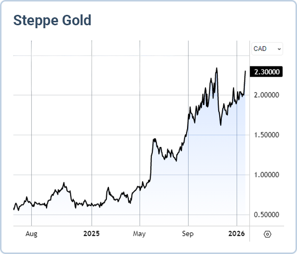 Die Entwicklung der Aktie, die wir in unseren Lesern in den vergangenen zwei Jahren immer und immer wieder ans Herz gelegt haben, ist schon jetzt bärenstark: Notierte der Titel 2024 zeitweise noch bei CAD 0,55, so ist der Aktienkurs seither auf CAD 2,30 um über 300 % gestiegen und dürfte noch längst nicht das Ende der Fahnenstange erreicht haben: Die Experten des Researchhauses Hannam & Partner haben ihr Kursziel für STEPPE GOLD Ende vergangener Woche auf CAD 4,26 angehoben, was nochmals fast 100 % über dem aktuellen Kursniveau liegt.