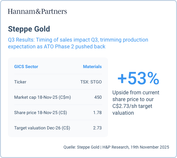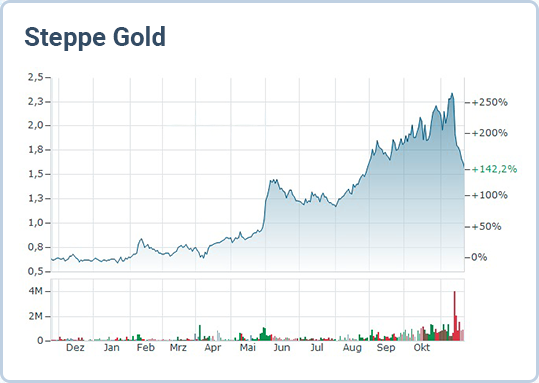 Eine spannende Einstiegschance finden Anleger derzeit etwa bei STEPPE GOLD! Das Unternehmen hat Mitte November seine Ergebnisse zum dritten Quartal präsentiert: Exakt 14.722 Unzen Gold hat die Company zwischen Juli und Ende September produziert, dabei 7.988 Unzen Gold im Berichtszeitraum und weitere 7.966 Unzen unmittelbar nach dem Quartalsende verkauft.