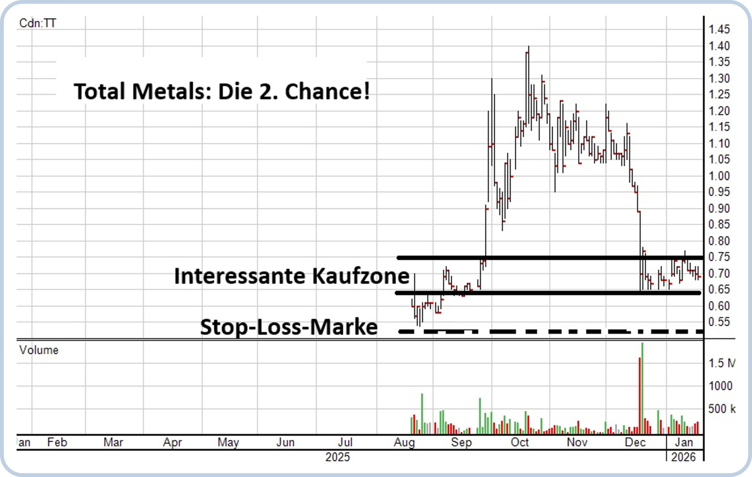 Bis Oktober zog der Aktienkurs von 0,60 CAD auf 1,40 CAD um satte 130% an, das Auslaufen einer Lock-Up-Frist dürfte im Dezember dafür verantwortlich gewesen sein, dass der Kurs wieder in den Bereich des Ausgangsniveaus zurückgefallen ist.