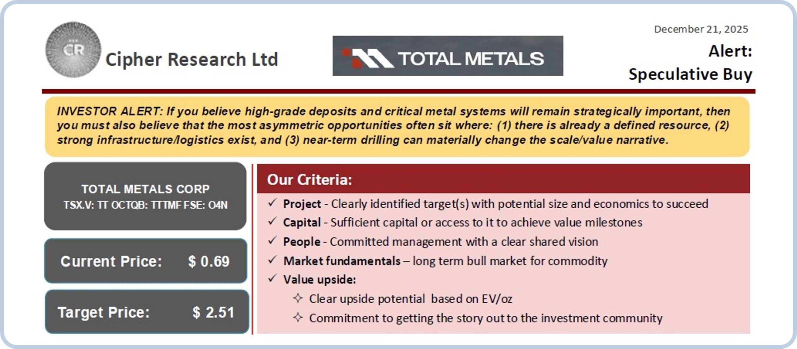 Verlag, Autor oder nahestehende Dritte halten Positionen in folgenden in diesem Brief genannten Aktien: –. Die Analysen folgender in dieser Veröffentlichung genannten Gesellschaften sind entgeltlich erstellt worden: Total Metals. Auf die damit verbundenen möglichen Interessenskonflikte wird ausdrücklich hingewiesen.