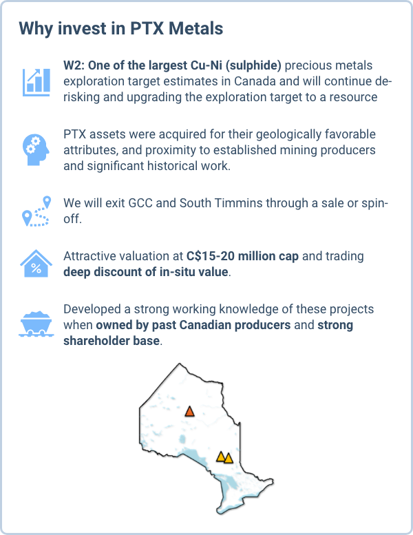 PTX METALS fokussiert sich auf qualitativ hochwertige Gold- und Kupfer-Nickel-Platin-Projekte in den weltberühmten Bergbaugebieten im Norden Ontarios! Mit einem Investment erhalten Anleger Zugang zu einigen der wertvollsten Metalle der Welt, darunter Gold, sowie zu den für die Energiewende wichtigen Mineralien Kupfer, Nickel, Uran und Metalle der Platin-Gruppe.